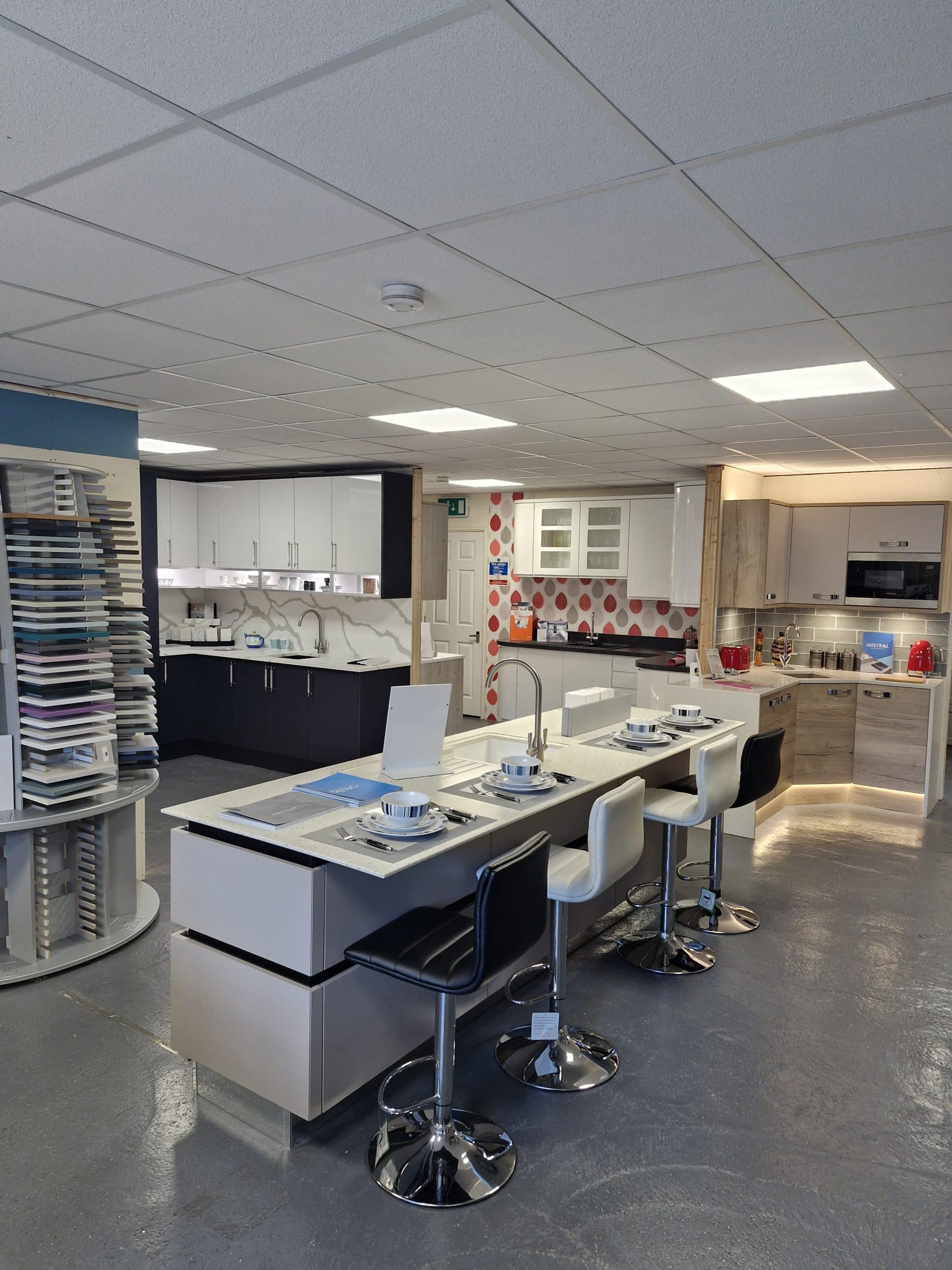 Our spacious showroom features over 30 displays showcasing the latest designs and finishes for Bathrooms and Kitchens.